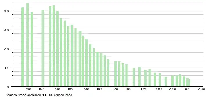 L'évolution du nombre d'habitants est connue à travers les recensements de la population effectués dans la commune depuis 1793. Pour les communes de moins de 10 000 habitants, une enquête de recensement portant sur toute la population est réalisée tous les cinq ans, les populations de référence des années intermédiaires étant quant à elles estimées par interpolation ou extrapolation[24]. Pour la commune, le premier recensement exhaustif entrant dans le cadre du nouveau dispositif a été réalisé en 2005[25].