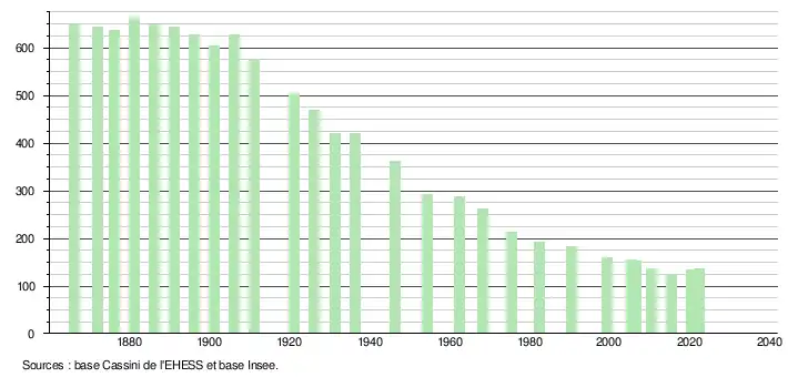 L'évolution du nombre d'habitants est connue à travers les recensements de la population effectués dans la commune depuis 1866. Pour les communes de moins de 10 000 habitants, une enquête de recensement portant sur toute la population est réalisée tous les cinq ans, les populations de référence des années intermédiaires étant quant à elles estimées par interpolation ou extrapolation[15]. Pour la commune, le premier recensement exhaustif entrant dans le cadre du nouveau dispositif a été réalisé en 2005[16].