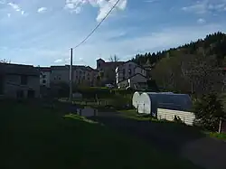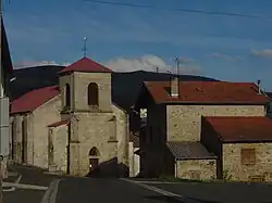 Centre du village de Saint-Pierre-la-Bourlhonne. Monts du Forez au fond. | |||||