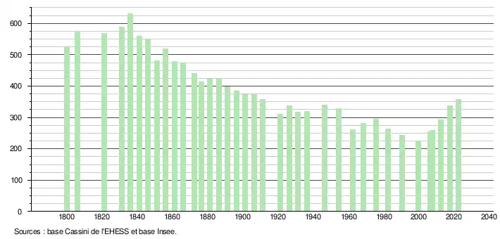 L'évolution du nombre d'habitants est connue à travers les recensements de la population effectués dans la commune depuis 1800. Pour les communes de moins de 10 000 habitants, une enquête de recensement portant sur toute la population est réalisée tous les cinq ans, les populations de référence des années intermédiaires étant quant à elles estimées par interpolation ou extrapolation[25]. Pour la commune, le premier recensement exhaustif entrant dans le cadre du nouveau dispositif a été réalisé en 2007[26].