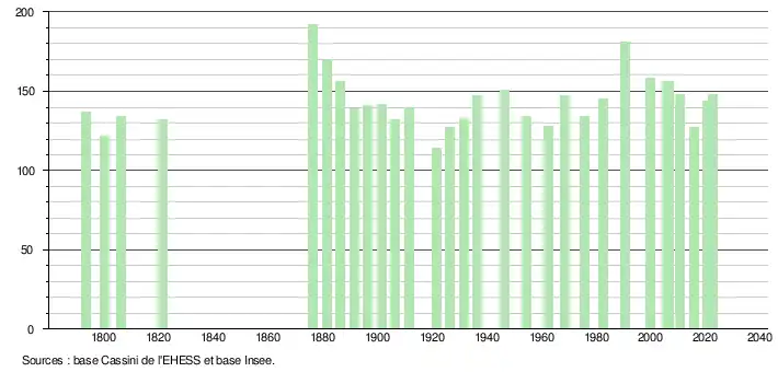 L'évolution du nombre d'habitants est connue à travers les recensements de la population effectués dans la commune depuis 1793. Pour les communes de moins de 10 000 habitants, une enquête de recensement portant sur toute la population est réalisée tous les cinq ans, les populations de référence des années intermédiaires étant quant à elles estimées par interpolation ou extrapolation[18]. Pour la commune, le premier recensement exhaustif entrant dans le cadre du nouveau dispositif a été réalisé en 2005[19].