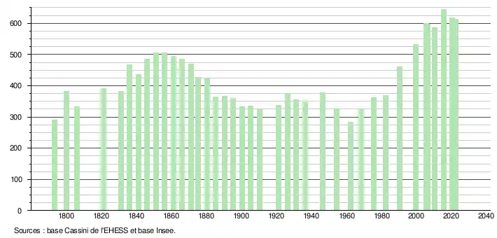 L'évolution du nombre d'habitants est connue à travers les recensements de la population effectués dans la commune depuis 1793. Pour les communes de moins de 10 000 habitants, une enquête de recensement portant sur toute la population est réalisée tous les cinq ans, les populations de référence des années intermédiaires étant quant à elles estimées par interpolation ou extrapolation[20]. Pour la commune, le premier recensement exhaustif entrant dans le cadre du nouveau dispositif a été réalisé en 2005[21].