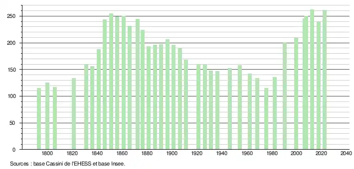 L'évolution du nombre d'habitants est connue à travers les recensements de la population effectués dans la commune depuis 1793. Pour les communes de moins de 10 000 habitants, une enquête de recensement portant sur toute la population est réalisée tous les cinq ans, les populations de référence des années intermédiaires étant quant à elles estimées par interpolation ou extrapolation[26]. Pour la commune, le premier recensement exhaustif entrant dans le cadre du nouveau dispositif a été réalisé en 2007[27].