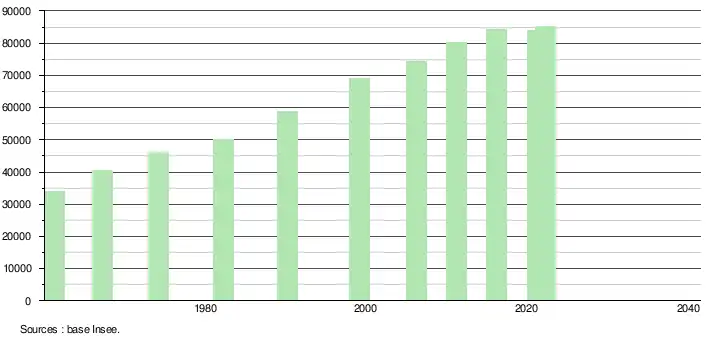 - ↑ Par convention dans Wikipédia, le principe a été retenu de n’afficher dans le tableau des recensements et le graphique, pour les populations de référence postérieures à 1999, que les populations correspondant à une enquête exhaustive de recensement pour les communes de moins de 10 000 habitants, et que les populations des années 2006, 2011, 2016, etc. pour les communes de plus de 10 000 habitants, ainsi que la dernière population de référence publiée par l’Insee pour l'ensemble des communes.