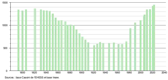 L'évolution du nombre d'habitants est connue à travers les recensements de la population effectués dans la commune depuis 1793. Pour les communes de moins de 10 000 habitants, une enquête de recensement portant sur toute la population est réalisée tous les cinq ans, les populations de référence des années intermédiaires étant quant à elles estimées par interpolation ou extrapolation[34]. Pour la commune, le premier recensement exhaustif entrant dans le cadre du nouveau dispositif a été réalisé en 2005[35].