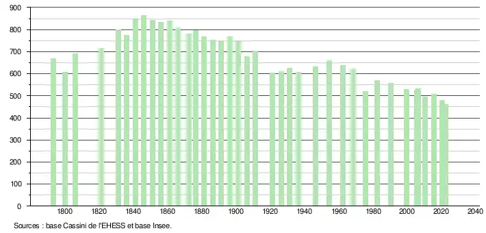 L'évolution du nombre d'habitants est connue à travers les recensements de la population effectués dans la commune depuis 1793. Pour les communes de moins de 10 000 habitants, une enquête de recensement portant sur toute la population est réalisée tous les cinq ans, les populations de référence des années intermédiaires étant quant à elles estimées par interpolation ou extrapolation[38]. Pour la commune, le premier recensement exhaustif entrant dans le cadre du nouveau dispositif a été réalisé en 2005[39].