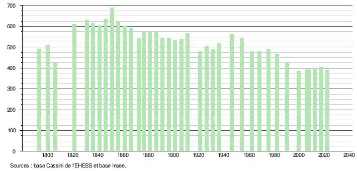 L'évolution du nombre d'habitants est connue à travers les recensements de la population effectués dans la commune depuis 1793. Pour les communes de moins de 10 000 habitants, une enquête de recensement portant sur toute la population est réalisée tous les cinq ans, les populations de référence des années intermédiaires étant quant à elles estimées par interpolation ou extrapolation[22]. Pour la commune, le premier recensement exhaustif entrant dans le cadre du nouveau dispositif a été réalisé en 2007[23].