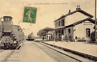 - Transport ferroviaire : la ville dispose d'une ancienne gare SNCF (gare de Saint-Pol-de-Léon). La gare a énormément évolué depuis une vingtaine d'années. Elle a été longtemps entre les décennies 1950 et 1980 la première gare légumière d'Europe. Elle se trouve au sud de la ville. La ligne de Morlaix à Roscoff est suspendue depuis , une inondation ayant emporté un tronçon de l'emprise ferroviaire et bloqué la circulation des trains. Des discussions et études sont menées depuis 2018 pour la rétablir ou la transformer en voie verte[22].