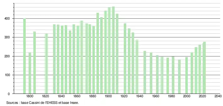 L'évolution du nombre d'habitants est connue à travers les recensements de la population effectués dans la commune depuis 1793. Pour les communes de moins de 10 000 habitants, une enquête de recensement portant sur toute la population est réalisée tous les cinq ans, les populations de référence des années intermédiaires étant quant à elles estimées par interpolation ou extrapolation[12]. Pour la commune, le premier recensement exhaustif entrant dans le cadre du nouveau dispositif a été réalisé en 2006[13].