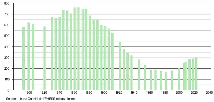 L'évolution du nombre d'habitants est connue à travers les recensements de la population effectués dans la commune depuis 1793. Pour les communes de moins de 10 000 habitants, une enquête de recensement portant sur toute la population est réalisée tous les cinq ans, les populations de référence des années intermédiaires étant quant à elles estimées par interpolation ou extrapolation[15]. Pour la commune, le premier recensement exhaustif entrant dans le cadre du nouveau dispositif a été réalisé en 2008[16].