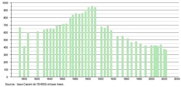 L'évolution du nombre d'habitants est connue à travers les recensements de la population effectués dans la commune depuis 1793. Pour les communes de moins de 10 000 habitants, une enquête de recensement portant sur toute la population est réalisée tous les cinq ans, les populations de référence des années intermédiaires étant quant à elles estimées par interpolation ou extrapolation[18]. Pour la commune, le premier recensement exhaustif entrant dans le cadre du nouveau dispositif a été réalisé en 2004[19].