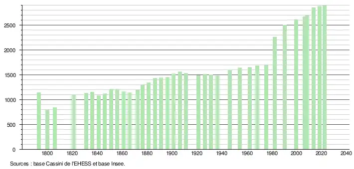 L'évolution du nombre d'habitants est connue à travers les recensements de la population effectués dans la commune depuis 1793. Pour les communes de moins de 10 000 habitants, une enquête de recensement portant sur toute la population est réalisée tous les cinq ans, les populations de référence des années intermédiaires étant quant à elles estimées par interpolation ou extrapolation[28]. Pour la commune, le premier recensement exhaustif entrant dans le cadre du nouveau dispositif a été réalisé en 2008[29].
