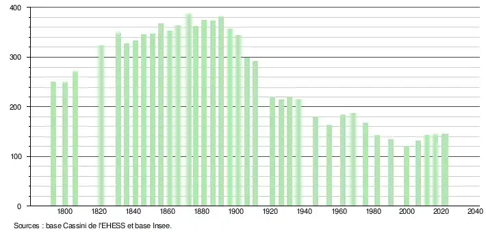 L'évolution du nombre d'habitants est connue à travers les recensements de la population effectués dans la commune depuis 1793. Pour les communes de moins de 10 000 habitants, une enquête de recensement portant sur toute la population est réalisée tous les cinq ans, les populations de référence des années intermédiaires étant quant à elles estimées par interpolation ou extrapolation[19]. Pour la commune, le premier recensement exhaustif entrant dans le cadre du nouveau dispositif a été réalisé en 2006[20].