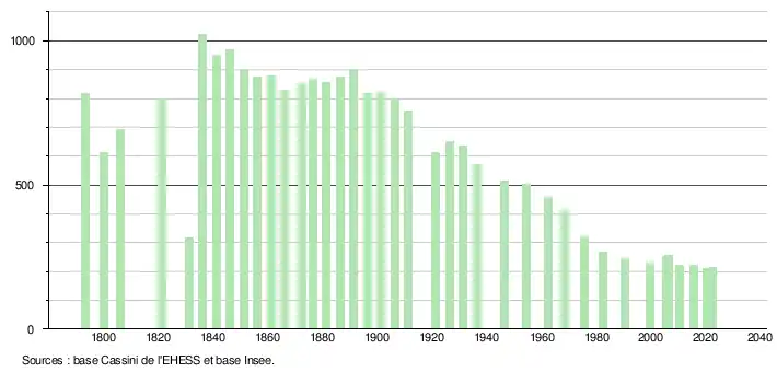 L'évolution du nombre d'habitants est connue à travers les recensements de la population effectués dans la commune depuis 1793. Pour les communes de moins de 10 000 habitants, une enquête de recensement portant sur toute la population est réalisée tous les cinq ans, les populations de référence des années intermédiaires étant quant à elles estimées par interpolation ou extrapolation[19]. Pour la commune, le premier recensement exhaustif entrant dans le cadre du nouveau dispositif a été réalisé en 2005[20].