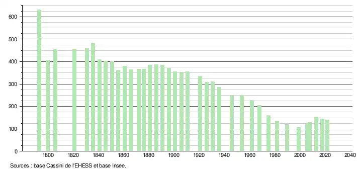 L'évolution du nombre d'habitants est connue à travers les recensements de la population effectués dans la commune depuis 1793. Pour les communes de moins de 10 000 habitants, une enquête de recensement portant sur toute la population est réalisée tous les cinq ans, les populations de référence des années intermédiaires étant quant à elles estimées par interpolation ou extrapolation[13]. Pour la commune, le premier recensement exhaustif entrant dans le cadre du nouveau dispositif a été réalisé en 2008[14].