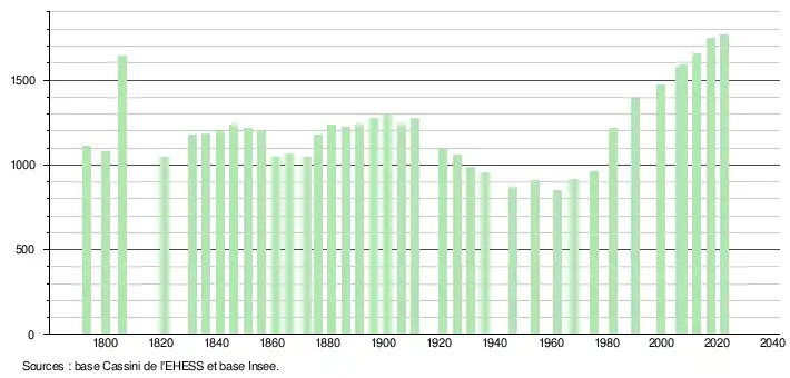 L'évolution du nombre d'habitants est connue à travers les recensements de la population effectués dans la commune depuis 1793. Pour les communes de moins de 10 000 habitants, une enquête de recensement portant sur toute la population est réalisée tous les cinq ans, les populations de référence des années intermédiaires étant quant à elles estimées par interpolation ou extrapolation[28]. Pour la commune, le premier recensement exhaustif entrant dans le cadre du nouveau dispositif a été réalisé en 2007[29].