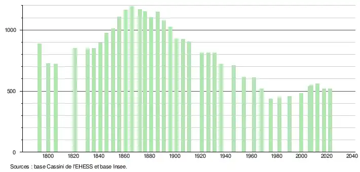 L'évolution du nombre d'habitants est connue à travers les recensements de la population effectués dans la commune depuis 1793. Pour les communes de moins de 10 000 habitants, une enquête de recensement portant sur toute la population est réalisée tous les cinq ans, les populations de référence des années intermédiaires étant quant à elles estimées par interpolation ou extrapolation[12]. Pour la commune, le premier recensement exhaustif entrant dans le cadre du nouveau dispositif a été réalisé en 2007[13].