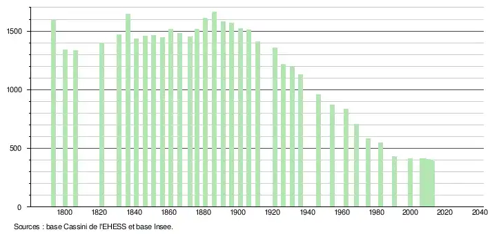 L'évolution du nombre d'habitants est connue à travers les recensements de la population effectués dans la commune depuis 1793. Pour les communes de moins de 10 000 habitants, une enquête de recensement portant sur toute la population est réalisée tous les cinq ans, les populations de référence des années intermédiaires étant quant à elles estimées par interpolation ou extrapolation[16]. Pour la commune, le premier recensement exhaustif entrant dans le cadre du nouveau dispositif a été réalisé en 2017[17].