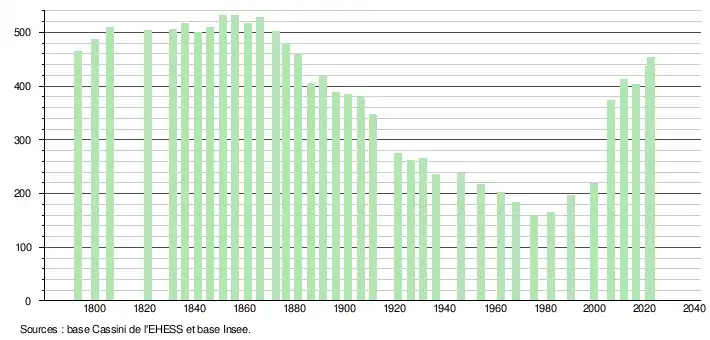 L'évolution du nombre d'habitants est connue à travers les recensements de la population effectués dans la commune depuis 1793. Pour les communes de moins de 10000habitants, une enquête de recensement portant sur toute la population est réalisée tous les cinqans, les populations de référence des années intermédiaires étant quant à elles estimées par interpolation ou extrapolation[42]. Pour la commune, le premier recensement exhaustif entrant dans le cadre du nouveau dispositif a été réalisé en 2006[43].