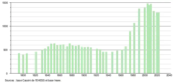 L'évolution du nombre d'habitants est connue à travers les recensements de la population effectués dans la commune depuis 1793. Pour les communes de moins de 10 000 habitants, une enquête de recensement portant sur toute la population est réalisée tous les cinq ans, les populations de référence des années intermédiaires étant quant à elles estimées par interpolation ou extrapolation[25]. Pour la commune, le premier recensement exhaustif entrant dans le cadre du nouveau dispositif a été réalisé en 2004[26].
