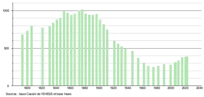 L'évolution du nombre d'habitants est connue à travers les recensements de la population effectués dans la commune depuis 1793. Pour les communes de moins de 10 000 habitants, une enquête de recensement portant sur toute la population est réalisée tous les cinq ans, les populations de référence des années intermédiaires étant quant à elles estimées par interpolation ou extrapolation[28]. Pour la commune, le premier recensement exhaustif entrant dans le cadre du nouveau dispositif a été réalisé en 2005[29].