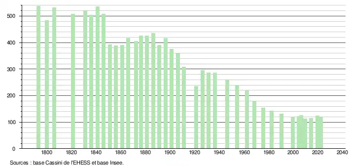L'évolution du nombre d'habitants est connue à travers les recensements de la population effectués dans la commune depuis 1793. Pour les communes de moins de 10 000 habitants, une enquête de recensement portant sur toute la population est réalisée tous les cinq ans, les populations de référence des années intermédiaires étant quant à elles estimées par interpolation ou extrapolation[14]. Pour la commune, le premier recensement exhaustif entrant dans le cadre du nouveau dispositif a été réalisé en 2004[15].