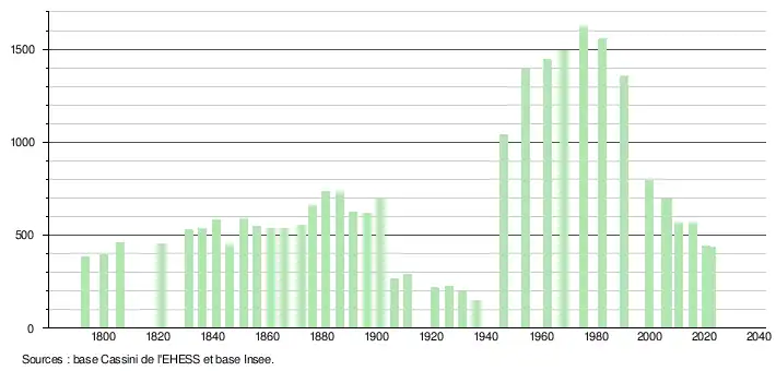 L'évolution du nombre d'habitants est connue à travers les recensements de la population effectués dans la commune depuis 1793. Pour les communes de moins de 10 000 habitants, une enquête de recensement portant sur toute la population est réalisée tous les cinq ans, les populations de référence des années intermédiaires étant quant à elles estimées par interpolation ou extrapolation[22]. Pour la commune, le premier recensement exhaustif entrant dans le cadre du nouveau dispositif a été réalisé en 2005[23].