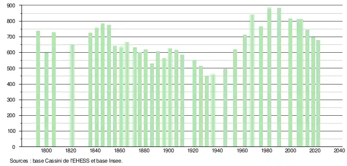 L'évolution du nombre d'habitants est connue à travers les recensements de la population effectués dans la commune depuis 1793. Pour les communes de moins de 10 000 habitants, une enquête de recensement portant sur toute la population est réalisée tous les cinq ans, les populations de référence des années intermédiaires étant quant à elles estimées par interpolation ou extrapolation[13]. Pour la commune, le premier recensement exhaustif entrant dans le cadre du nouveau dispositif a été réalisé en 2008[14].