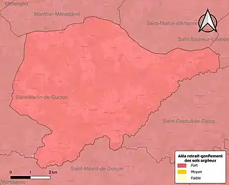 Les mouvements de terrains susceptibles de se produire sur la commune sont des tassements différentiels[42]. Le retrait-gonflement des sols argileux est susceptible d'engendrer des dommages importants aux bâtiments en cas d’alternance de périodes de sécheresse et de pluie[43]. La totalité de la commune est en aléa moyen ou fort (58,6 % au niveau départemental et 48,5 % au niveau national métropolitain)[Carte 4]. Depuis le , en application de la loi ÉLAN, différentes contraintes s'imposent aux vendeurs, maîtres d'ouvrages ou constructeurs de biens situés dans une zone classée en aléa moyen ou fort[Note 4],[44].