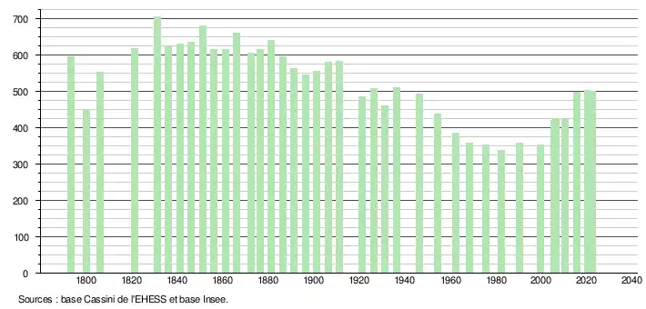 - ↑ Population municipale de référence en vigueur au 1er janvier 2025, millésimée 2022, définie dans les limites territoriales en vigueur au 1er janvier 2024, date de référence statistique : 1er janvier 2022.