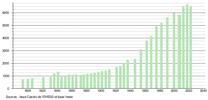 L'évolution du nombre d'habitants est connue à travers les recensements de la population effectués dans la commune depuis 1793. Pour les communes de moins de 10 000 habitants, une enquête de recensement portant sur toute la population est réalisée tous les cinq ans, les populations de référence des années intermédiaires étant quant à elles estimées par interpolation ou extrapolation[18]. Pour la commune, le premier recensement exhaustif entrant dans le cadre du nouveau dispositif a été réalisé en 2007[19].
