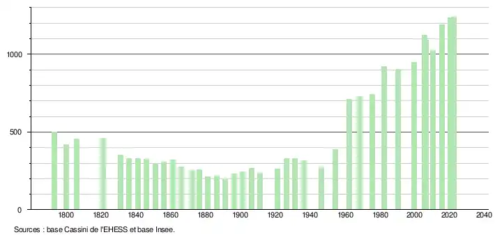 L'évolution du nombre d'habitants est connue à travers les recensements de la population effectués dans la commune depuis 1793. Pour les communes de moins de 10 000 habitants, une enquête de recensement portant sur toute la population est réalisée tous les cinq ans, les populations de référence des années intermédiaires étant quant à elles estimées par interpolation ou extrapolation[21]. Pour la commune, le premier recensement exhaustif entrant dans le cadre du nouveau dispositif a été réalisé en 2005[22].