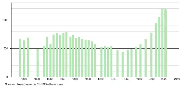 L'évolution du nombre d'habitants est connue à travers les recensements de la population effectués dans la commune depuis 1793. Pour les communes de moins de 10 000 habitants, une enquête de recensement portant sur toute la population est réalisée tous les cinq ans, les populations de référence des années intermédiaires étant quant à elles estimées par interpolation ou extrapolation[19]. Pour la commune, le premier recensement exhaustif entrant dans le cadre du nouveau dispositif a été réalisé en 2006[20].
