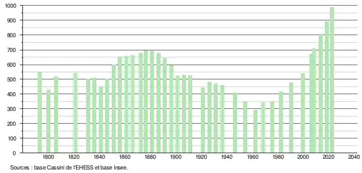 L'évolution du nombre d'habitants est connue à travers les recensements de la population effectués dans la commune depuis 1793. Pour les communes de moins de 10 000 habitants, une enquête de recensement portant sur toute la population est réalisée tous les cinq ans, les populations de référence des années intermédiaires étant quant à elles estimées par interpolation ou extrapolation[12]. Pour la commune, le premier recensement exhaustif entrant dans le cadre du nouveau dispositif a été réalisé en 2008[13].