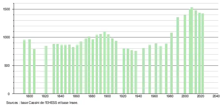 L'évolution du nombre d'habitants est connue à travers les recensements de la population effectués dans la commune depuis 1793. Pour les communes de moins de 10 000 habitants, une enquête de recensement portant sur toute la population est réalisée tous les cinq ans, les populations de référence des années intermédiaires étant quant à elles estimées par interpolation ou extrapolation[15]. Pour la commune, le premier recensement exhaustif entrant dans le cadre du nouveau dispositif a été réalisé en 2008[16].