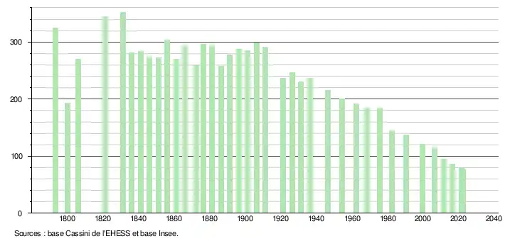 L'évolution du nombre d'habitants est connue à travers les recensements de la population effectués dans la commune depuis 1793. Pour les communes de moins de 10 000 habitants, une enquête de recensement portant sur toute la population est réalisée tous les cinq ans, les populations de référence des années intermédiaires étant quant à elles estimées par interpolation ou extrapolation[16]. Pour la commune, le premier recensement exhaustif entrant dans le cadre du nouveau dispositif a été réalisé en 2006[17].
