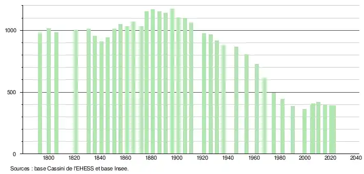 L'évolution du nombre d'habitants est connue à travers les recensements de la population effectués dans la commune depuis 1793. Pour les communes de moins de 10 000 habitants, une enquête de recensement portant sur toute la population est réalisée tous les cinq ans, les populations de référence des années intermédiaires étant quant à elles estimées par interpolation ou extrapolation[20]. Pour la commune, le premier recensement exhaustif entrant dans le cadre du nouveau dispositif a été réalisé en 2005[21].