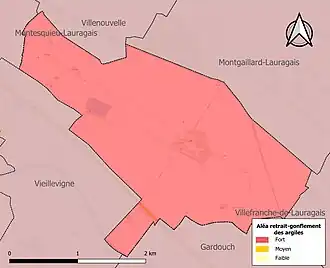 Le retrait-gonflement des sols argileux est susceptible d'engendrer des dommages importants aux bâtiments en cas d’alternance de périodes de sécheresse et de pluie. La totalité de la commune est en aléa moyen ou fort (88,8 % au niveau départemental et 48,5 % au niveau national). Sur les 28 bâtiments dénombrés sur la commune en 2019, 28 sont en aléa moyen ou fort, soit 100 %, à comparer aux 98 % au niveau départemental et 54 % au niveau national. Une cartographie de l'exposition du territoire national au retrait gonflement des sols argileux est disponible sur le site du BRGM[24],[Carte 3].