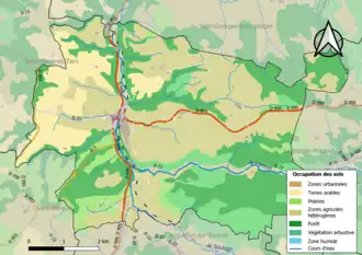 L'occupation des sols de la commune, telle qu'elle ressort de la base de données européenne d’occupation biophysique des sols Corine Land Cover (CLC), est marquée par l'importance des territoires agricoles (55,2 % en 2018), en diminution par rapport à 1990 (58,1 %). La répartition détaillée en 2018 est la suivante : forêts (36,9 %), zones agricoles hétérogènes (35,7 %), terres arables (13,4 %), milieux à végétation arbustive et/ou herbacée (6,6 %), prairies (6,2 %), zones urbanisées (1,3 %)[28].