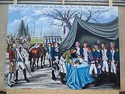 La peinture murale de Diana Taubin est un panneau mesurant 5 × 3,70 m. À droite sous la tente se trouvent les républicains. Près de la table, Ruelle représentant en mission est accompagné de plusieurs généraux. Derrière la tente une troupe de soldats républicains présente les armes.