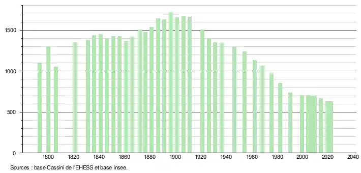 L'évolution du nombre d'habitants est connue à travers les recensements de la population effectués dans la commune depuis 1793. Pour les communes de moins de 10 000 habitants, une enquête de recensement portant sur toute la population est réalisée tous les cinq ans, les populations de référence des années intermédiaires étant quant à elles estimées par interpolation ou extrapolation[19]. Pour la commune, le premier recensement exhaustif entrant dans le cadre du nouveau dispositif a été réalisé en 2004[20].