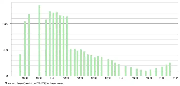 L'évolution du nombre d'habitants est connue à travers les recensements de la population effectués dans la commune depuis 1793. À partir du , les populations légales des communes sont publiées annuellement dans le cadre d'un recensement qui repose désormais sur une collecte d'information annuelle, concernant successivement tous les territoires communaux au cours d'une période de cinq ans. Pour les communes de moins de 10 000 habitants, une enquête de recensement portant sur toute la population est réalisée tous les cinq ans, les populations légales des années intermédiaires étant quant à elles estimées par interpolation ou extrapolation[1]. Pour la commune, le premier recensement exhaustif entrant dans le cadre du nouveau dispositif a été réalisé en 2005[2],[Note 1].