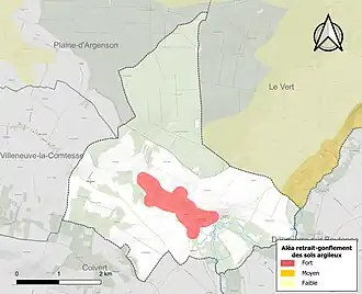 Le retrait-gonflement des sols argileux est susceptible d'engendrer des dommages importants aux bâtiments en cas d’alternance de périodes de sécheresse et de pluie. 6,9 % de la superficie communale est en aléa moyen ou fort (54,2 % au niveau départemental et 48,5 % au niveau national). Sur les 88 bâtiments dénombrés sur la commune en 2019, 63 sont en aléa moyen ou fort, soit 72 %, à comparer aux 57 % au niveau départemental et 54 % au niveau national. Une cartographie de l'exposition du territoire national au retrait gonflement des sols argileux est disponible sur le site du BRGM[12],[Carte 2].