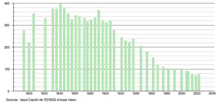 L'évolution du nombre d'habitants est connue à travers les recensements de la population effectués dans la commune depuis 1793. Pour les communes de moins de 10 000 habitants, une enquête de recensement portant sur toute la population est réalisée tous les cinq ans, les populations de référence des années intermédiaires étant quant à elles estimées par interpolation ou extrapolation[27]. Pour la commune, le premier recensement exhaustif entrant dans le cadre du nouveau dispositif a été réalisé en 2008[28].