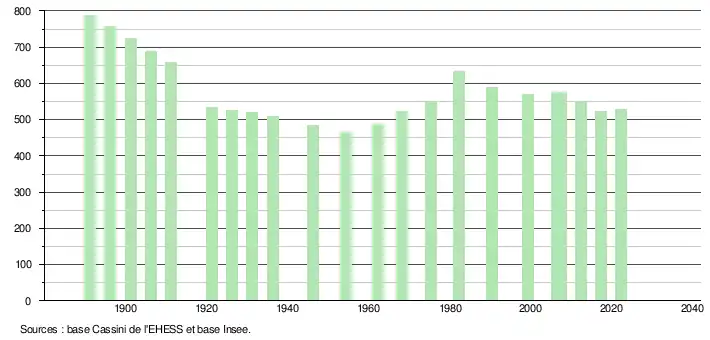 | L'évolution du nombre d'habitants est connue à travers les recensements de la population effectués dans la commune depuis 1891. Pour les communes de moins de 10 000 habitants, une enquête de recensement portant sur toute la population est réalisée tous les cinq ans, les populations de référence des années intermédiaires étant quant à elles estimées par interpolation ou extrapolation[30]. Pour la commune, le premier recensement exhaustif entrant dans le cadre du nouveau dispositif a été réalisé en 2007[31]. En 2022, la commune comptait 528 habitants[Note 4], en évolution de +0,19 % par rapport à 2016 (Tarn : +2,52 %, France hors Mayotte : +2,11 %). |