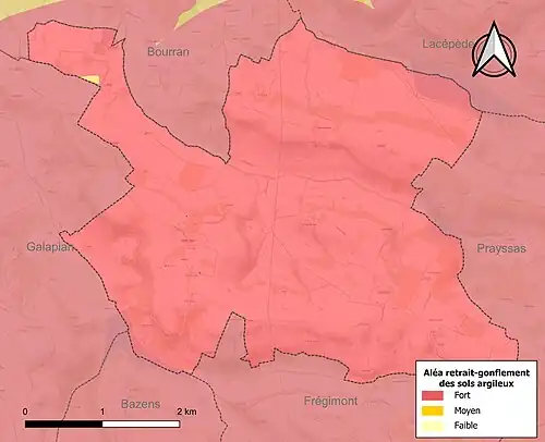 Le retrait-gonflement des sols argileux est susceptible d'engendrer des dommages importants aux bâtiments en cas d’alternance de périodes de sécheresse et de pluie[18]. La totalité de la commune est en aléa moyen ou fort (91,8 % au niveau départemental et 48,5 % au niveau national)[Carte 2]. Depuis le , en application de la loi ELAN, différentes contraintes s'imposent aux vendeurs, maîtres d'ouvrages ou constructeurs de biens situés dans une zone classée en aléa moyen ou fort[Note 3],[19].