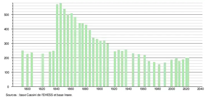 L'évolution du nombre d'habitants est connue à travers les recensements de la population effectués dans la commune depuis 1793. Pour les communes de moins de 10 000 habitants, une enquête de recensement portant sur toute la population est réalisée tous les cinq ans, les populations de référence des années intermédiaires étant quant à elles estimées par interpolation ou extrapolation[22]. Pour la commune, le premier recensement exhaustif entrant dans le cadre du nouveau dispositif a été réalisé en 2005[23].