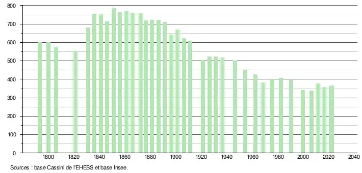 L'évolution du nombre d'habitants est connue à travers les recensements de la population effectués dans la commune depuis 1793. Pour les communes de moins de 10 000 habitants, une enquête de recensement portant sur toute la population est réalisée tous les cinq ans, les populations de référence des années intermédiaires étant quant à elles estimées par interpolation ou extrapolation[14]. Pour la commune, le premier recensement exhaustif entrant dans le cadre du nouveau dispositif a été réalisé en 2006[15].