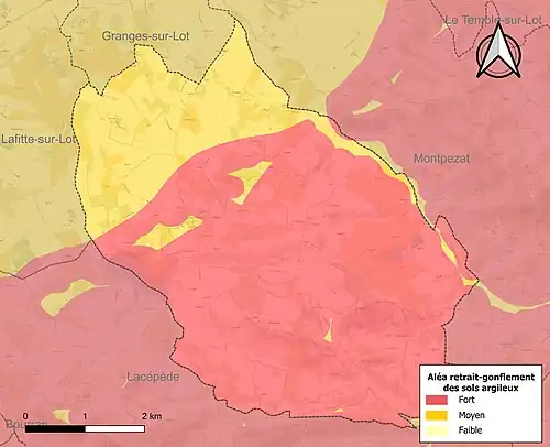 Le retrait-gonflement des sols argileux est susceptible d'engendrer des dommages importants aux bâtiments en cas d’alternance de périodes de sécheresse et de pluie[17]. La totalité de la commune est en aléa moyen ou fort (91,8 % au niveau départemental et 48,5 % au niveau national)[Carte 2]. Depuis le , en application de la loi ELAN, différentes contraintes s'imposent aux vendeurs, maîtres d'ouvrages ou constructeurs de biens situés dans une zone classée en aléa moyen ou fort[Note 1],[18].