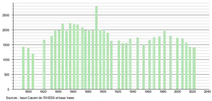 L'évolution du nombre d'habitants est connue à travers les recensements de la population effectués dans la commune depuis 1793. Pour les communes de moins de 10 000 habitants, une enquête de recensement portant sur toute la population est réalisée tous les cinq ans, les populations de référence des années intermédiaires étant quant à elles estimées par interpolation ou extrapolation[29]. Pour la commune, le premier recensement exhaustif entrant dans le cadre du nouveau dispositif a été réalisé en 2006[30].